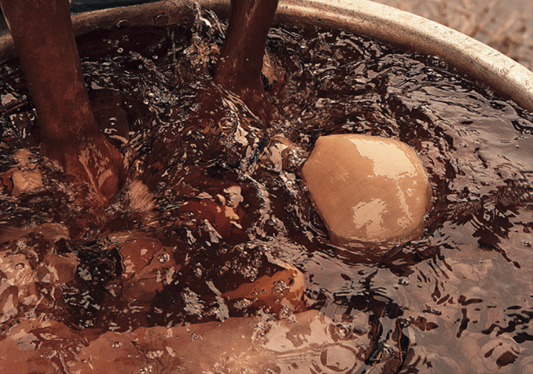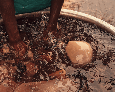 Raw cotton fabric is immersed in water mixed with cow or sheep dung.