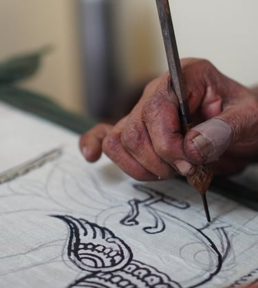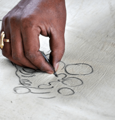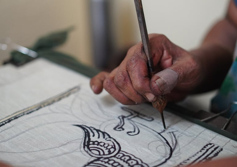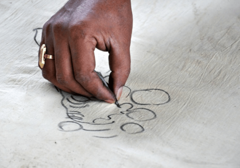 Artisans lightly sketch outlines onto the fabric using charcoal derived from burnt tamarind or palm twigs.