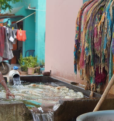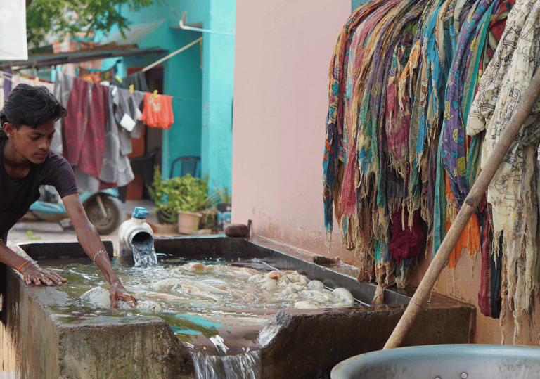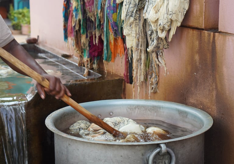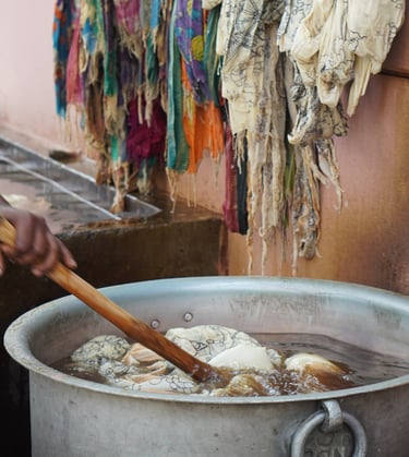The fabric is then immersed in a boiling dye bath made from roots like chay (Oldenlandia umbellata) or madder.